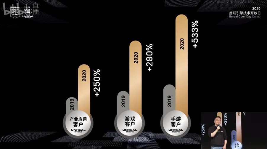在今天的Unreal Open Day Online大會上,Epic Games公佈了虛幻引擎的最新數據。截止今年,虛幻引擎在全球的用户數已經超過1000萬,其中,國內用户的MAU比起去年已經翻了一倍多。與此同時,國內使用虛幻引擎的遊戲客户數量同比增幅280%,其中手遊客户比去年多了533%。