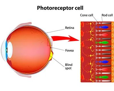 人眼究竟是怎麼識別顏色的呢?其實這與人類眼球視網膜(Retina)上的視錐細胞(Photoreceptor cell)有關。視錐細胞是視細胞的一種,因樹突為錐形而得名(如下圖所示)。每隻眼球上大約有600-700萬個視錐細胞,它們主要負責顏色識別,並且在相對較亮的光照下更能發揮作用。