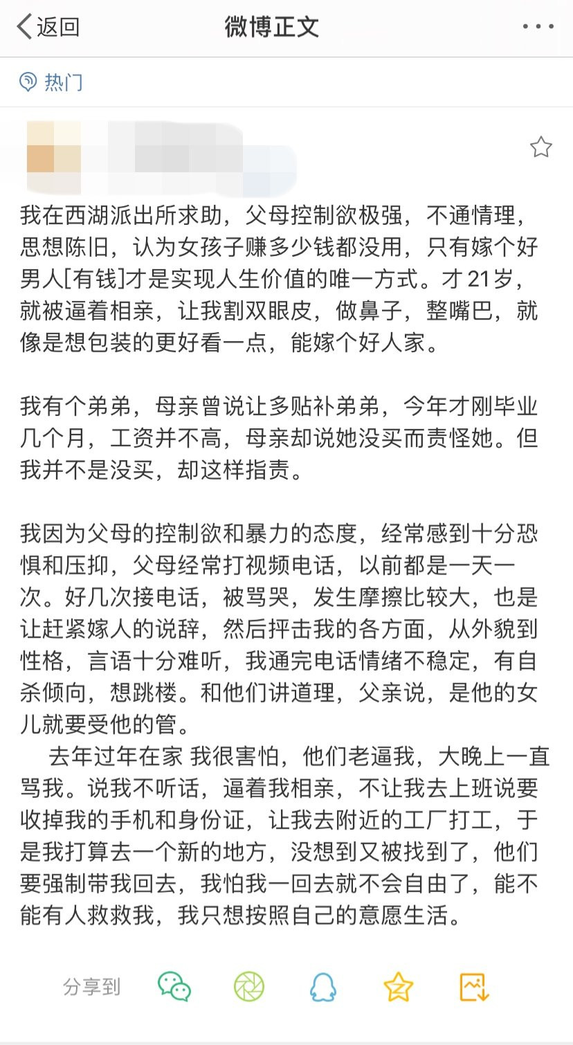 逼婚、逼整容、看管、打罵、控制……女孩的條條控訴,迅速引發了網友的高度關注。有擔心女孩安危的網友在跟帖中表示,自己清晨5時28分已經在趕往派出所“幫忙”的路上。