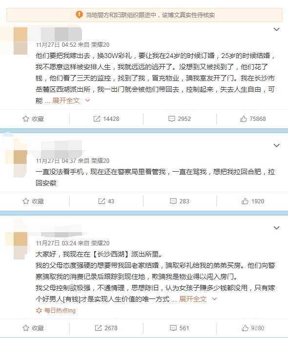 11月27日凌晨2時26分開始,一名女孩開始在微博連續發帖,稱父母為30萬元彩禮逼婚,自己逃離後又被找到,只能躲進長沙市嶽麓區公安局西湖派出所求助。