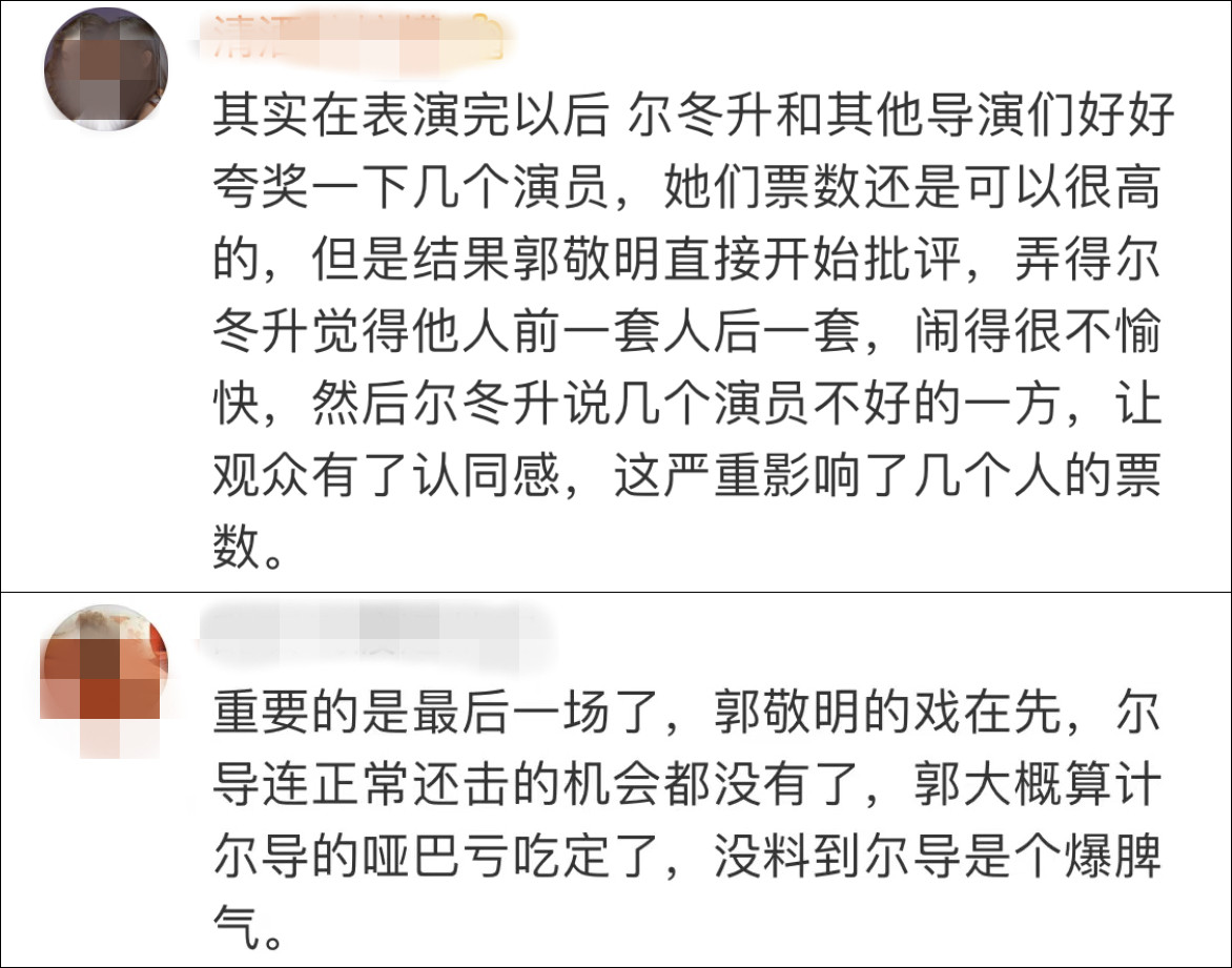 後來爾冬升也不讓郭敬明再評價了,自己先把倪虹潔、馬蘇和黃奕的表現不佳一通批評,説了句“不要有輸贏的心態,贏了冠軍不代表就能大紅”,暗示三人演戲時功利心太強。