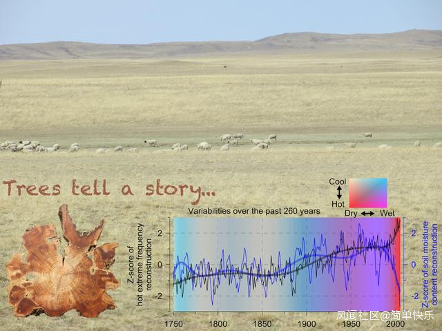 樹木講述了東亞內部的熱浪和乾旱歷史。該圖像顯示了中國北部內蒙古的一個景觀,一個蘇格松的年輪樣本。