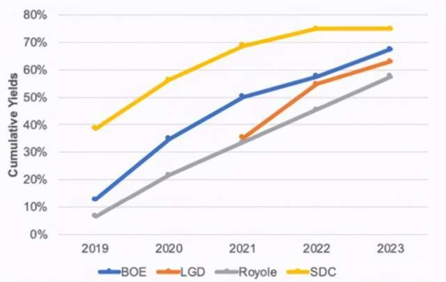 而產品質量方面柔宇科技似乎也隱人堪憂。此前,顯示器市場研究機構DSCC對市面上的主流摺疊手機面板做了一次調研,結果顯示,柔宇的面板良率要遠低於京東方等廠商。