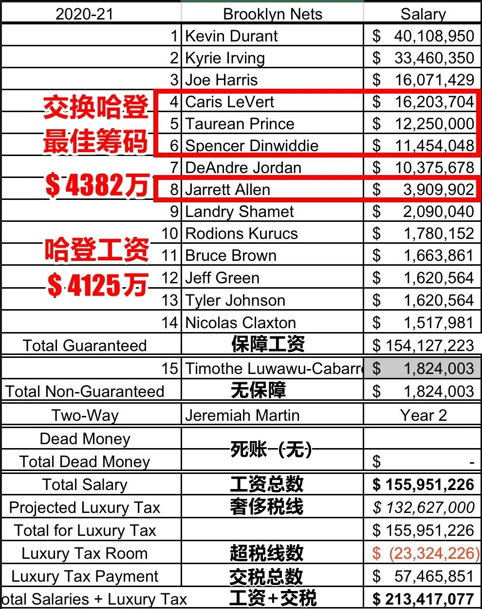 籃網組的這個團隊,當然開銷也很大,他們連工資帶奢侈税,加起來超過2億美元,是勇士之下第二大户。籃網上一次花這麼多錢,還是在2013-14賽季,為了得到加內特和皮爾斯,隊裏還有德隆和喬·約翰遜,他們交了9000多萬税。