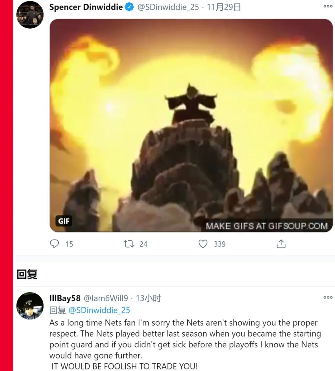 昨天丁維迪沒事發了一張《降世神通》的動圖,就引起了很多人的猜想:這是啥意思呢?是對最近總是捲入交易流言不滿嗎?有一種發揮出來的解讀:很久以前有水善族、土強族、火烈族以及氣和族,四族和睦相處,但火烈族發難,世界不寧,惟有能同時駕馭水土火氣四種神力的神通Avatar可以拯救世界,但在最需要他的時候,神通消失了……他是自信為降世神通,還是覺得杜蘭特和歐文一登場,自己就要消失了?是沒有機會了,還是要被換走?