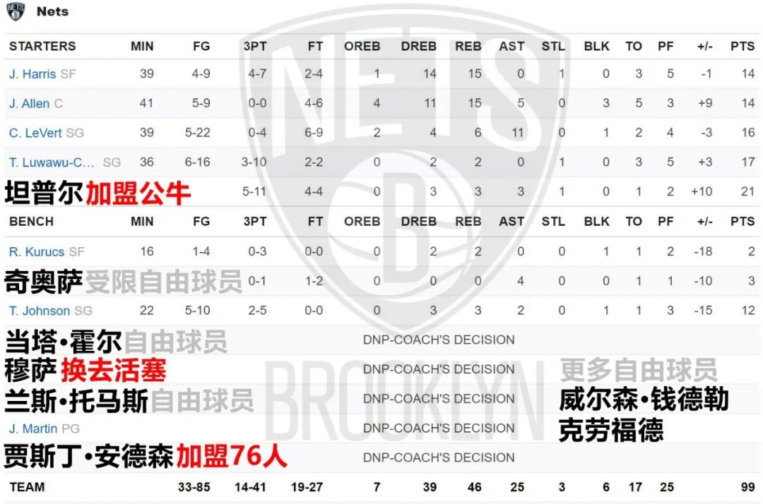 我們回頭看季後賽其中一場的陣容,少了哪些人:首發裏面惟一離開的是控衞坦普爾,因為歐文復出後,控球的人太多了;替補控衞奇奧薩是受限制的自由球員;其他幾位離開的,在上賽季後來都打不上球。