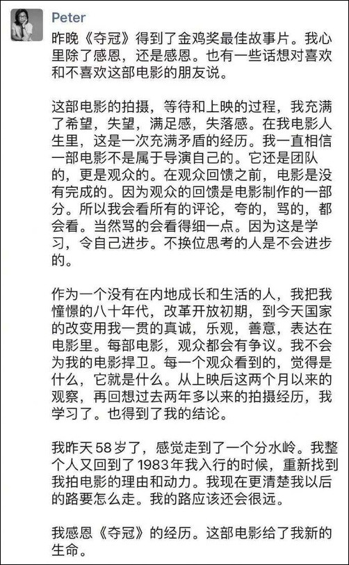 11月29日,影片導演陳可辛在朋友圈中發文回應獲獎並分享感想。