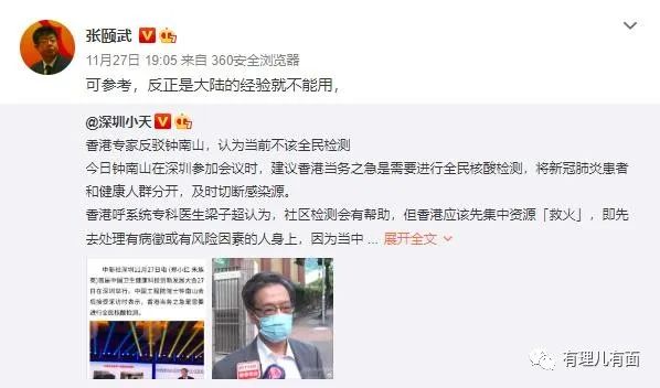 對於香港專家反駁鍾南山建議,北京大學中文系教授,博士生導師張頤武的評價是: 反正是大陸的經驗就不能用。