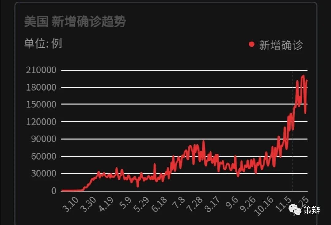 從公開的美國新冠病毒疫情數據看,10月31日,美國新增病例突破10萬大關,11月21日,更是創記錄的達到199718例。從上圖也不難看出,美新冠病例在11月上升的幅度,相當異常。