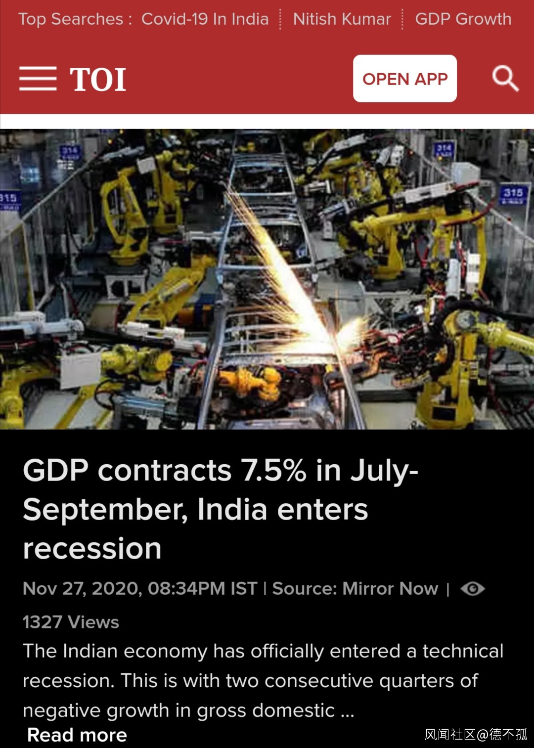 印度時報的報道截圖
