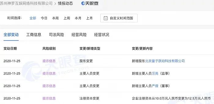 11月25日,蘇州神羅互娛網絡科技有限公司發生工商變更,股東新增北京量子躍動科技有限公司,持股20%。後者為字節跳動有限公司的全資子公司。