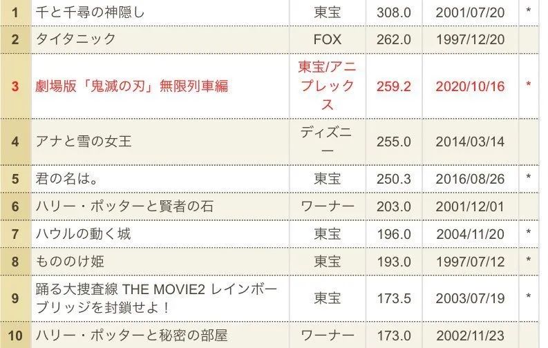 截至11月24日,根據鬼滅官方發佈的信息,《鬼滅之刃:無限列車篇》上映39天,累計票房259.17億日元,觀影人數1939萬7589人,已超越了《冰雪奇緣》**(255億日元)**在日本的票房,升至日本影史票房季軍的位置。