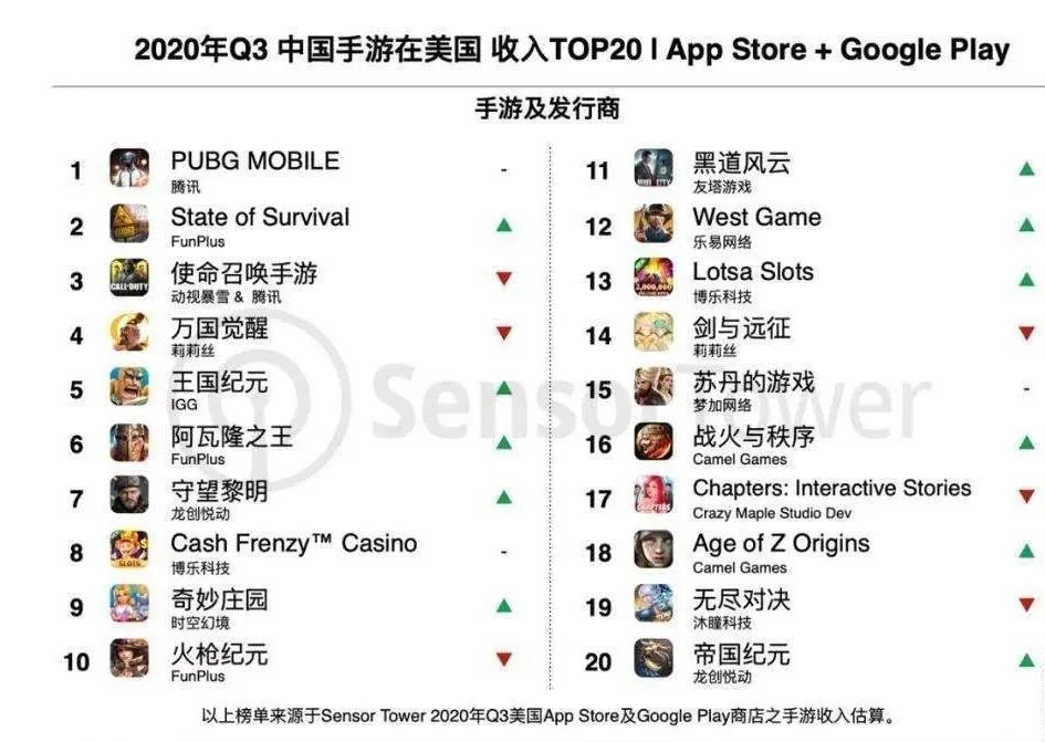11月25日,Sensor Tower商店情報最新數據顯示,2020年Q3美國手遊在App Store和Google Plya的總收入超過58億美元,依然是海外規模最大的手遊市場。