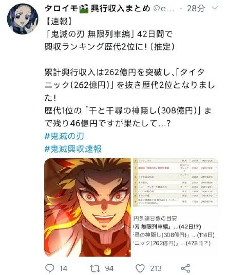 11月26日,《鬼滅之刃:無限列車篇》票房成功突破262億日元,超越《泰坦尼克號》**(262億日元)**位居日本影史票房亞軍。