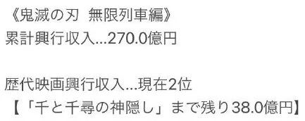 截至11月28日,該電影票房已累計約270億日元,目前距離排名第一的《千與千尋》還差38億日元。