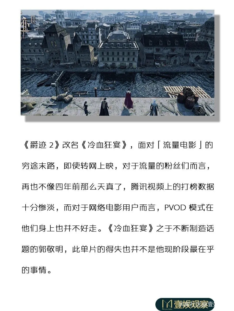 12月4日,蟄伏兩年的《爵跡2》更名《冷血狂宴》且放棄院線,以PVOD的模式轉網,登陸視頻平台擔任“郭家軍”先鋒,或迎接觀眾因郭敬明作品原罪論而引發的負面口碑的“狂轟濫炸”。