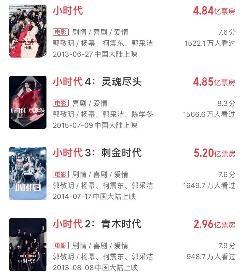 通過精準的市場定位(年輕學生粉絲羣體、暑期時間)、IP屬性的知名度、頂流明星的造勢能力、話題營銷的強勢性等產品思維打法,《小時代》也順勢開啓“流量電影”時代,並讓此類國產電影成為資本掙錢的專屬捷徑。
