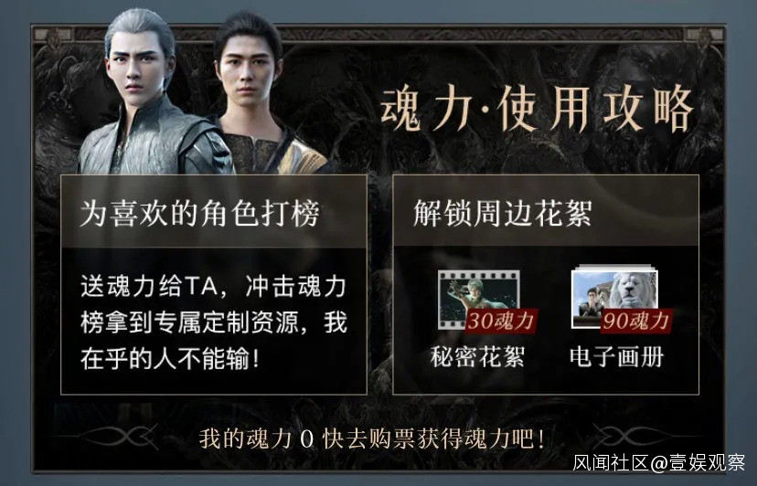 各位流量的粉絲們通過購買線上觀影票、觀看花絮預告片等方式(由於第二種方式獲得方式較難和上限較低,暫不統計)獲得“魂力值”,從而各家“愛豆”的角色打榜。每張線上觀影票可獲得20點魂力值,可多次購買獲得(上限200張)。獲得“魂力”TOP1的主演,可獲得騰訊視頻《冷血狂宴》專屬定製閃屏推廣資源。