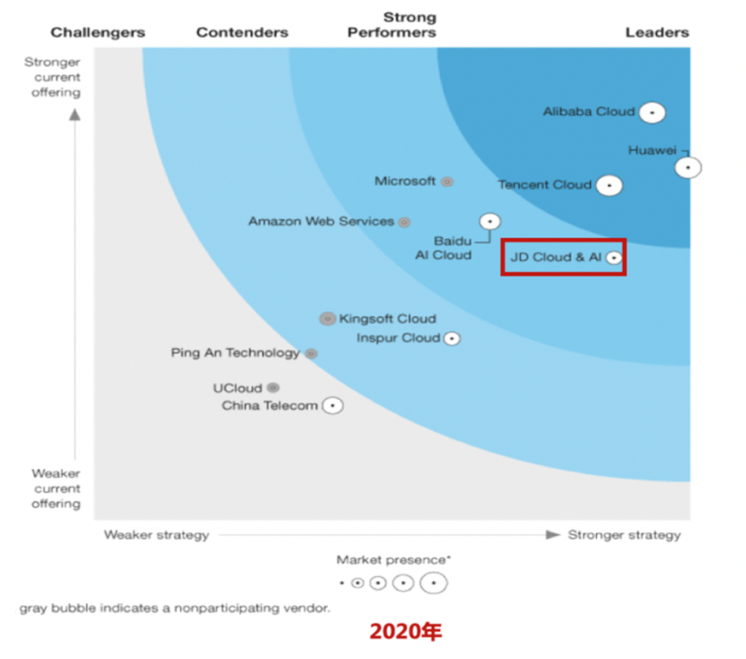 在國際權威分析機構Forrester發佈的《The Forrester Wave:公有云開發與基礎架構平台中國市場廠商評測》中,京東智聯雲其排名得到了進一步提升,被視為“戰略清晰明確且執行力強,智能供應鏈是獨特競爭優勢 ”。