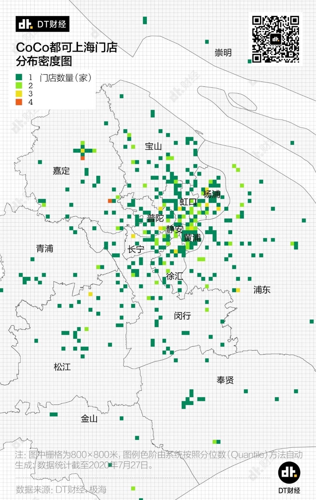 第二,CoCo沒有特別明顯的集中投放做法,在人口密集區域設置3家門店,是CoCo最常用的做法。