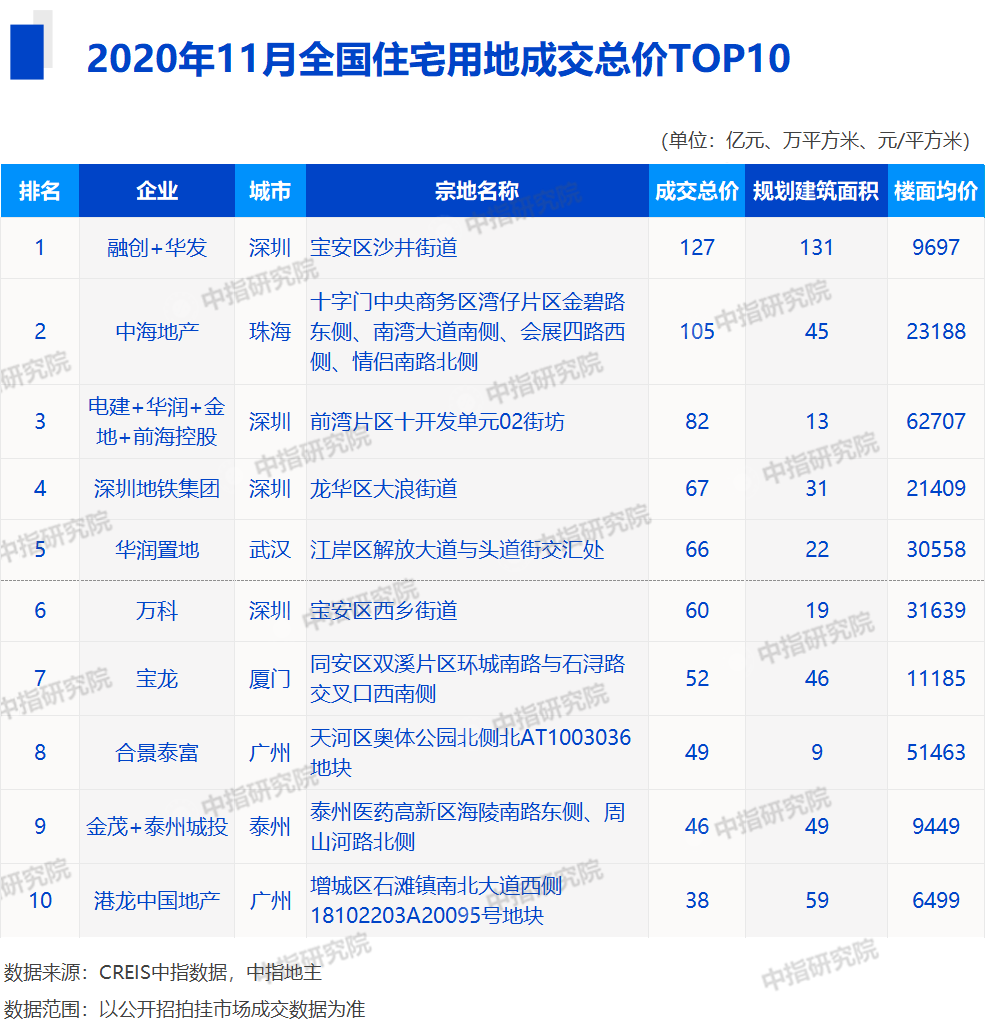 2020年1-11月全國房地產企業拿地排行榜_風聞