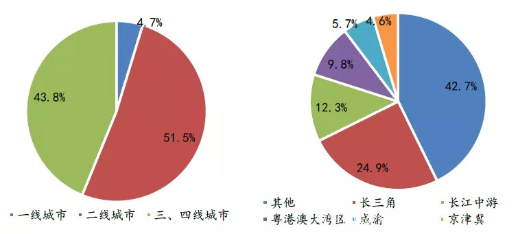圖:2020年1-11月50家代表房企拿地面積城市等級、區域分佈情況