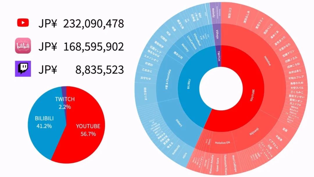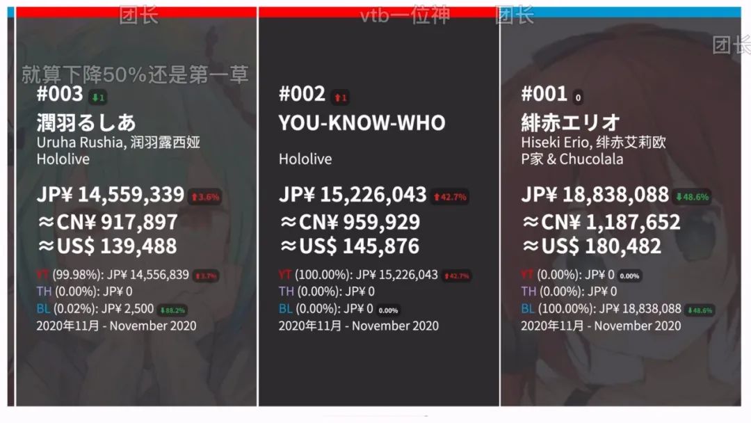 這個數據對平台來説很香,對主播個人來説卻不太靠得住。對於B站、油管這樣的平台,大盤收益是可觀的。11月B站SC流水達到1.68億日元(約1000萬元)一年下來也有小1億的總流水,排除分成基本是純賺,足以成為財報裏有分量的一部分。