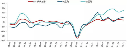 圖:2019年以來50個代表城市及長三角、珠三角代表城市商品住宅成交面積同比走勢