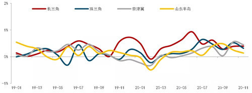 圖:2019年至2020年11月重點城市羣新建住宅均價環比漲幅