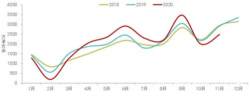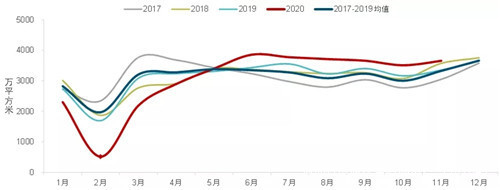 圖:2017-2020年11月50個代表城市商品住宅月度成交面積走勢