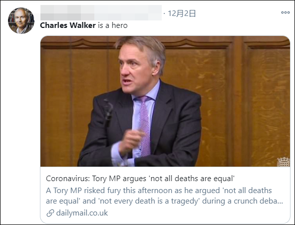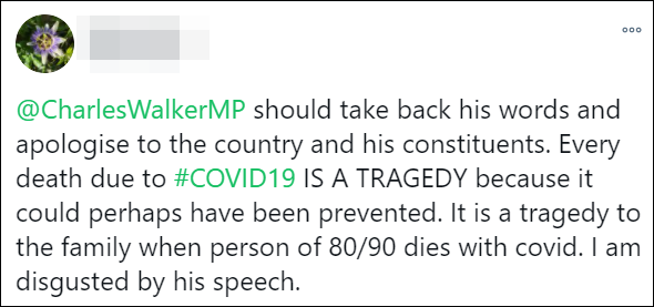 “查爾斯爵士應該收回他的話,向國家和選民道歉。每一個新冠疫情造成的死亡都是一場悲劇,因為它本可以避免。八九十歲的老人死於新冠疫情,對這個家庭來説是一個悲劇。我討厭他的演講。”
