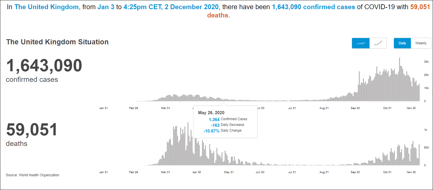 據世界衞生組織最新數據顯示,截至到當地時間12月2日下午4:25,英國累計確診1643090例,死亡59051例。12月2日,英國單日新增病例13429例,新增死亡603例。