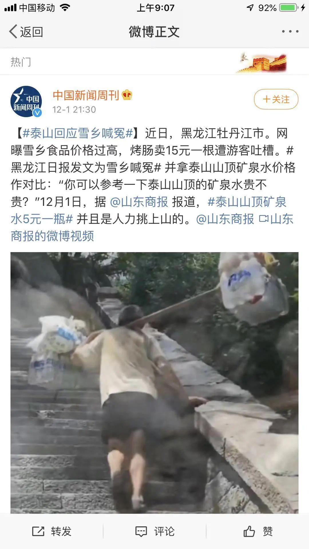 素在一邊無所事事的山東商報逮到機會,衝出來搶戲:泰山山頂礦泉水5元一瓶,並且是人力挑上山的。
