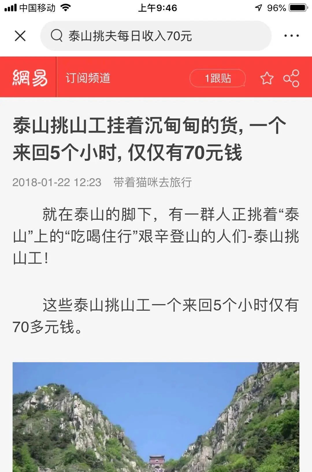 ——這就是泰山挑夫被擠壓到無以存活的原因,他們的價值被一些人看低,挑夫們每日收到的70元錢,並不是他們的勞務費用,而是他們的“身價”。