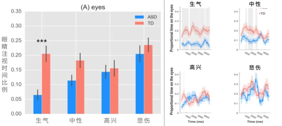 我們主要關注的是孤獨症孩子看眼睛、嘴巴,還有整張面孔的時間。我們發現,他們還是在看眼睛的時候出現了一些異常,並且他們 在加工生氣面孔的時候出現了最多的異常 。