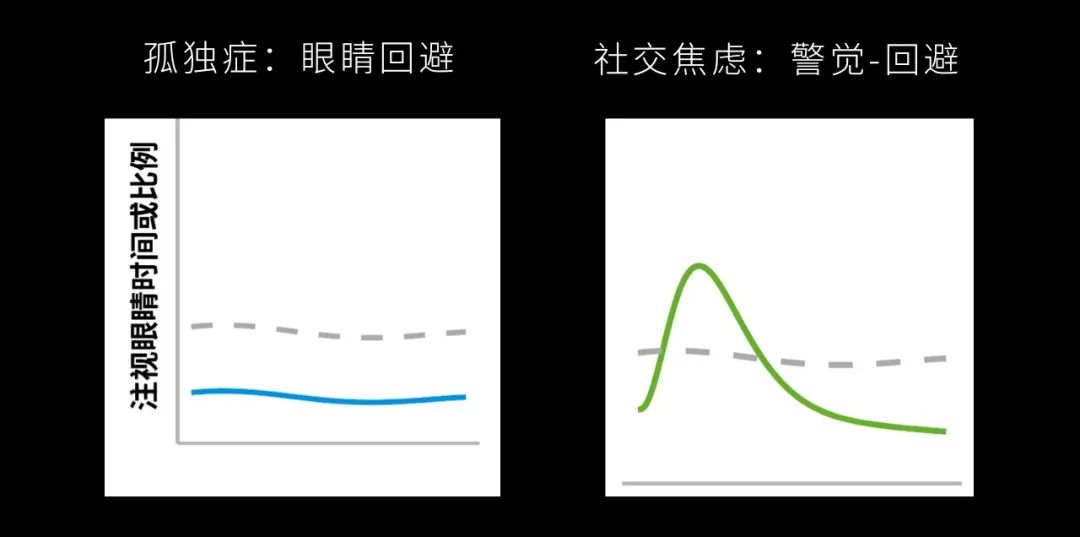 這個虛線代表正常孩子,孤獨症孩子相對於這條虛線來説,是一直處於迴避的狀態。而社交焦慮的人最開始的時候看眼睛看得更多,然後就會出現下降。所以我們可以在眼動的數據上對這兩種疾病進行一個區分。