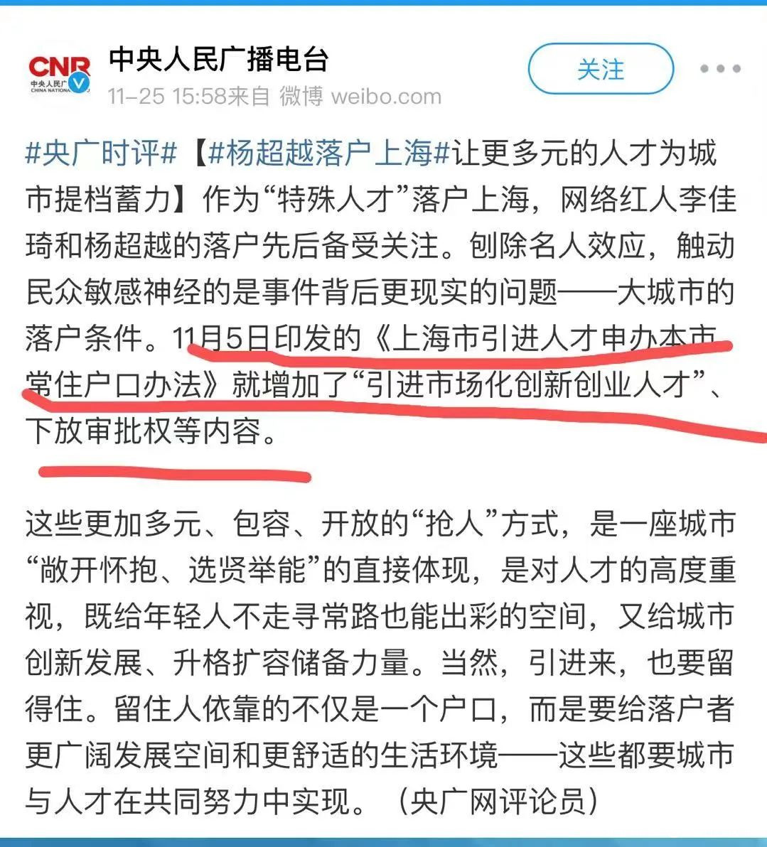 説句題外話,如果僅僅按照學歷來定義人才,那馬雲、馬化騰這種普通大學畢業的學生,可能永遠都拿到上海户籍的。上海曾經錯失過馬雲,深知對人才的定義不能太機械、太嚴謹。
