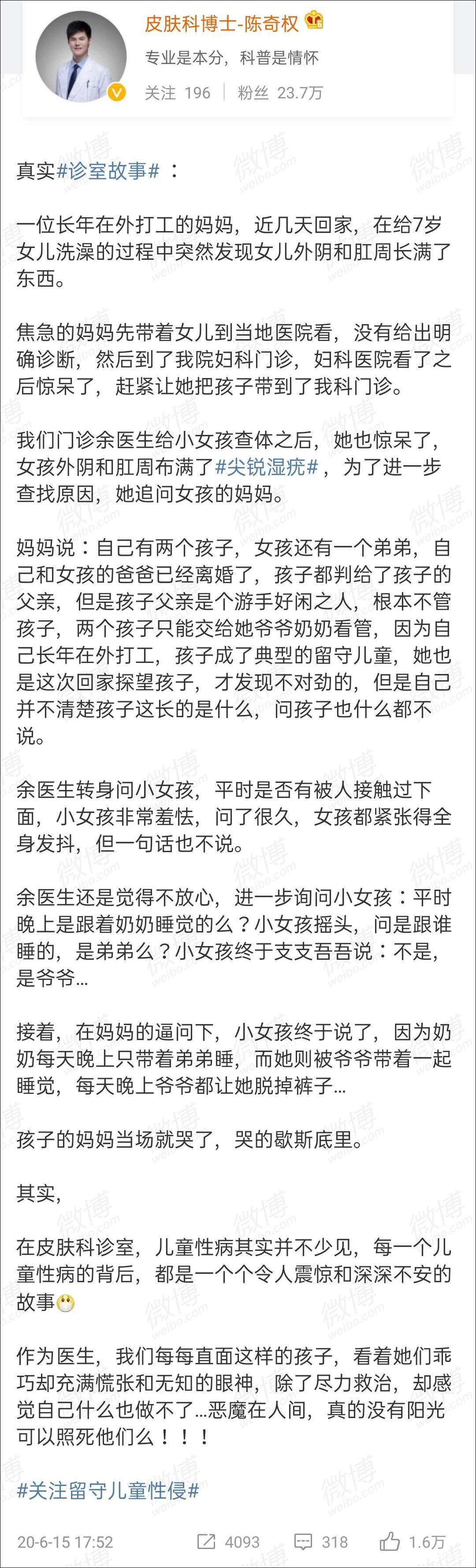 今年6月16日,微博博主@皮膚科博士-陳奇權 發佈微博稱,自己同事接診的一名7歲小女孩,感染嚴重性病。經過追問才得知,該女孩長期遭受爺爺性侵。