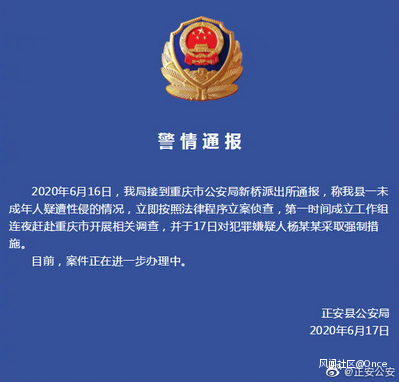 同時,重慶警方也向貴州警方發出警情通報。在檢察機關的監督下,6月17日,貴州正安警方對犯罪嫌疑人楊某某以涉嫌強姦罪立案偵查。
