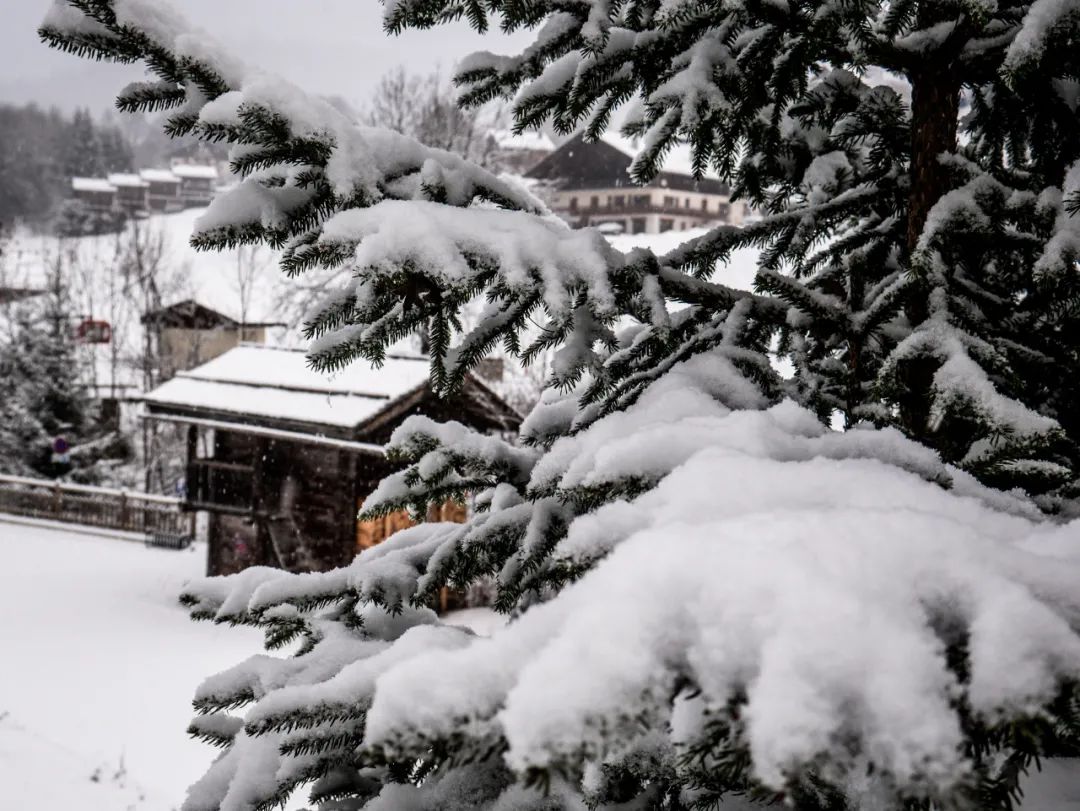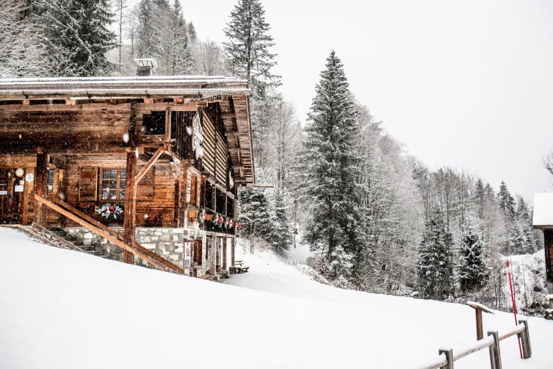 瞧瞧這景色多美,皚皚白雪飄灑下來,覆上了木屋,覆上了樹椏,這些照片像是在無聲地告訴大家:快來滑雪呀~