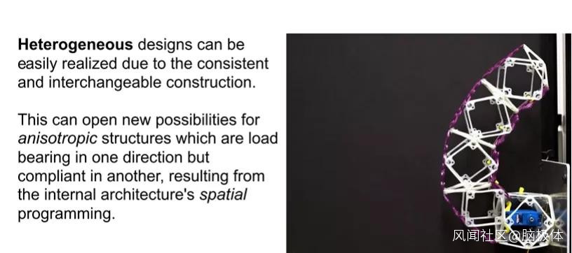 由於一個體素組合而成的結構可以表現出與子單元一模一樣的行為方式,這就相當於一個整體就可以作為一個更大整體結構的部分,中間的結合件等於可以消失不見,形成連續的整體式材料。