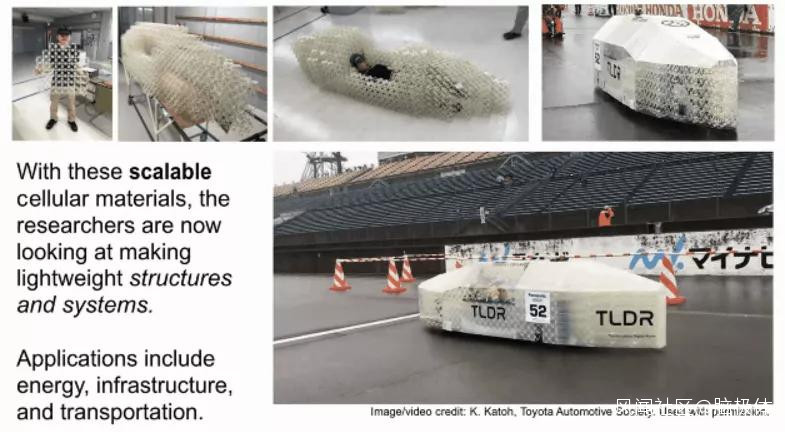 最近MIT的團隊已經和豐田合作,推出了這一“體素”賽車。這輛汽車除了電機和電源外,其餘零件都是由體素構成的。據研究團隊介紹,他們使用了一個月時間就組裝出這一輕量化、高剛性的結構,而如果採用之前傳統的玻璃纖維結構方法建造一個類似的結構需要一年的時間。