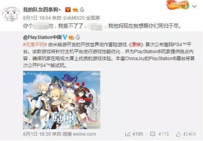 只為了傳達出中國遊戲玩家的一個態度:不能接受《原神》登錄索尼PS4,不能接受一款有抄襲瑕疵的遊戲,代表中國向世界展覽。