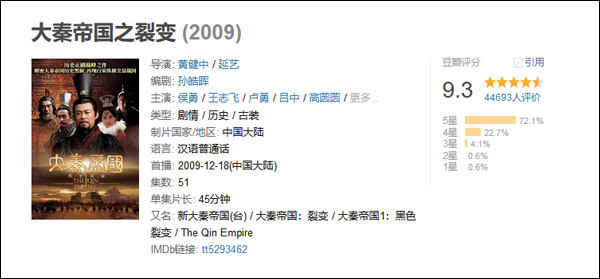 2009年,“大秦帝國”系列推出第一部《大秦帝國之裂變》,豆瓣評分9.3,重點講述了秦孝公重商鞅而變法的故事,本片聚集了侯勇、王志飛、李立羣和高圓圓等一批觀眾熟悉的演員,是幾個系列中最煽情的作品,許多人廢寢忘食追劇,最後哭成了淚人。