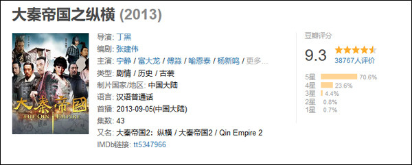 2013年,“大秦帝國”系列推出第二部《大秦帝國之縱橫》,豆瓣評分9.2分,重點講述了秦惠文王重張儀而縱橫的故事,本片聚集了寧靜、富大龍、喻恩泰和李立羣等實力派演員。