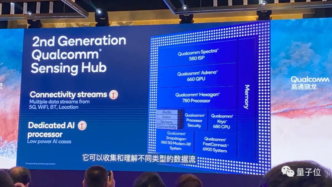但驍龍888中,還有第二代高通傳感器中樞集成的專用低功耗AI處理器,能夠利用情境感知,並結合來自5G、Wi-Fi和藍牙等新增的數據源,有了收集和理解額外的數據流的能力。