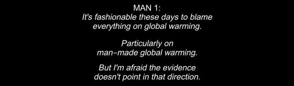 在森林大火、暴雨、洪水和颶風的畫面下,畫外音裏播放着導演採訪到的8種典型的對氣候問題的看法: