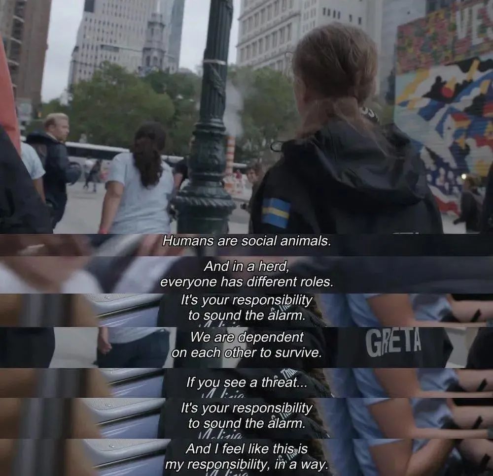 對於即將要生活在那個不可知的未來的孩子們來説,現在掌控話語權的“大人們”並沒有給到他們足夠的安全感和信任,他們只能用自己的方式表達自己的生存焦慮和責任感。這或許是格蕾塔和那些飽受氣候焦慮的年輕人的一種主要的行為動機。