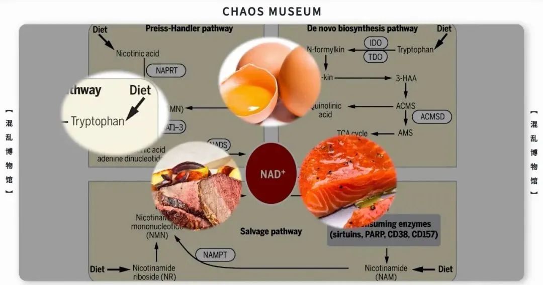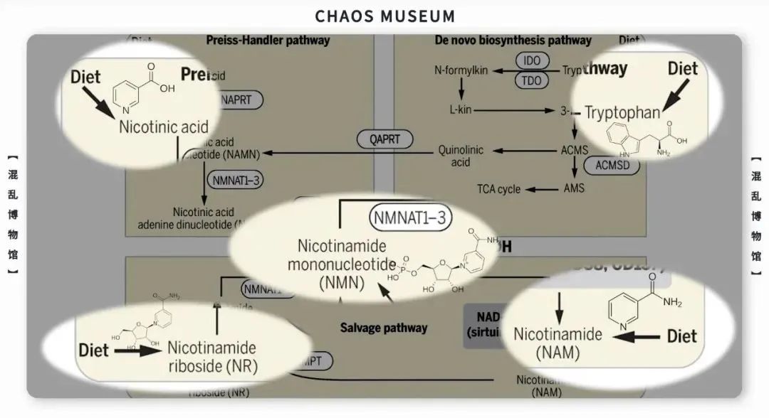 人們通過研究NAD的代謝路徑,找到了合成NAD所需原料。其中就包括了開頭提到的Trp色氨酸(Tryptophan),NA煙酸 (Nicotinic Acid),NAM煙酰胺(Nicotinamide),NR煙酰胺核糖(Nicotinamide riboside),NMN煙酰胺單核苷酸(Nicotinamide Mononucleotide)等。