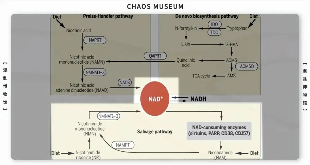 人體內的細胞不能直接利用物質中的化學能,而是需要將這些能量兑換成通用貨幣也就是ATP。而NAD就像是細胞內進行貨幣兑換的銀行,將化學能大小不同的物質,通過中介變成統一的能量貨幣並支付給各種「打工人」——NAD消耗蛋白。